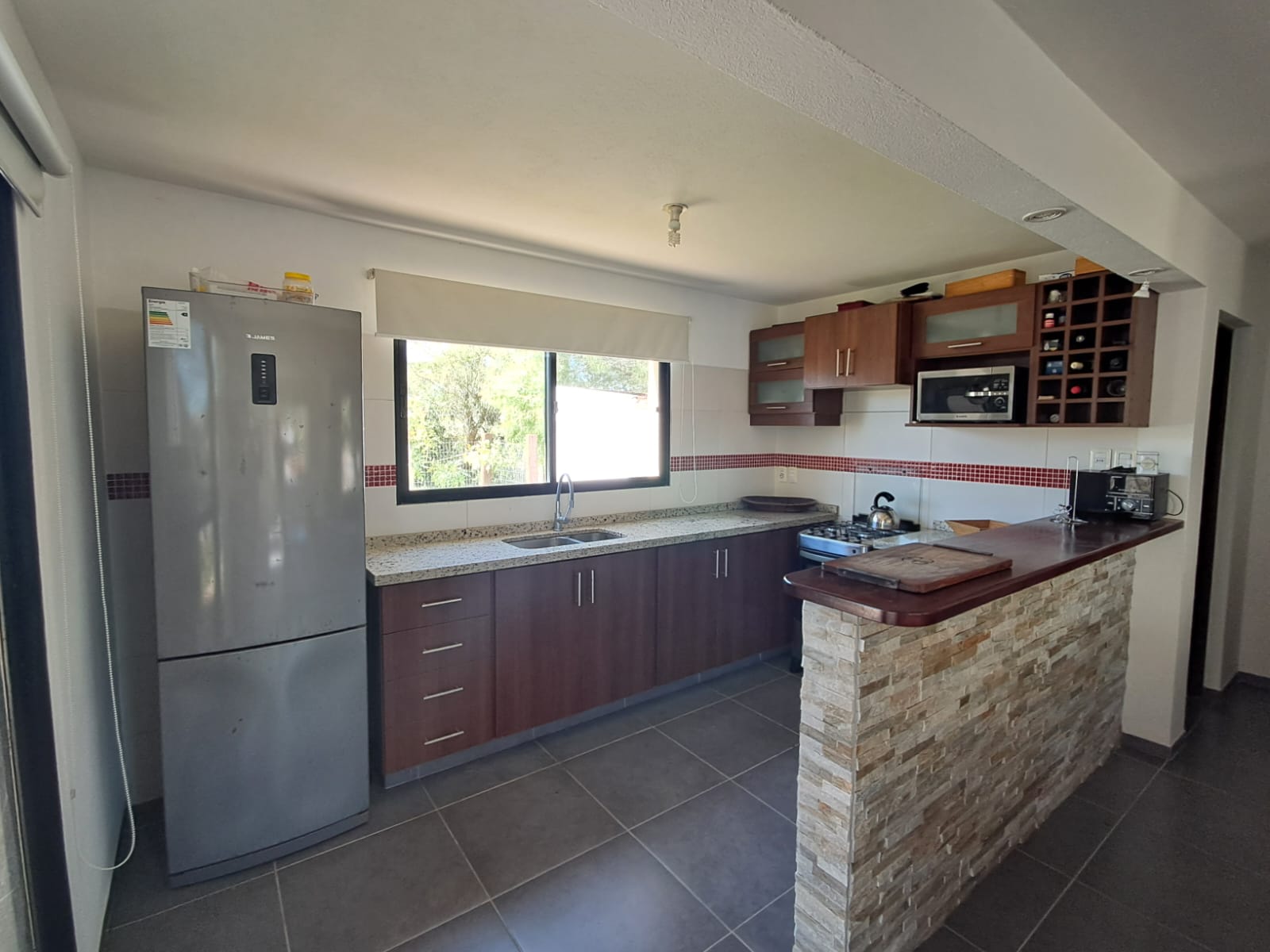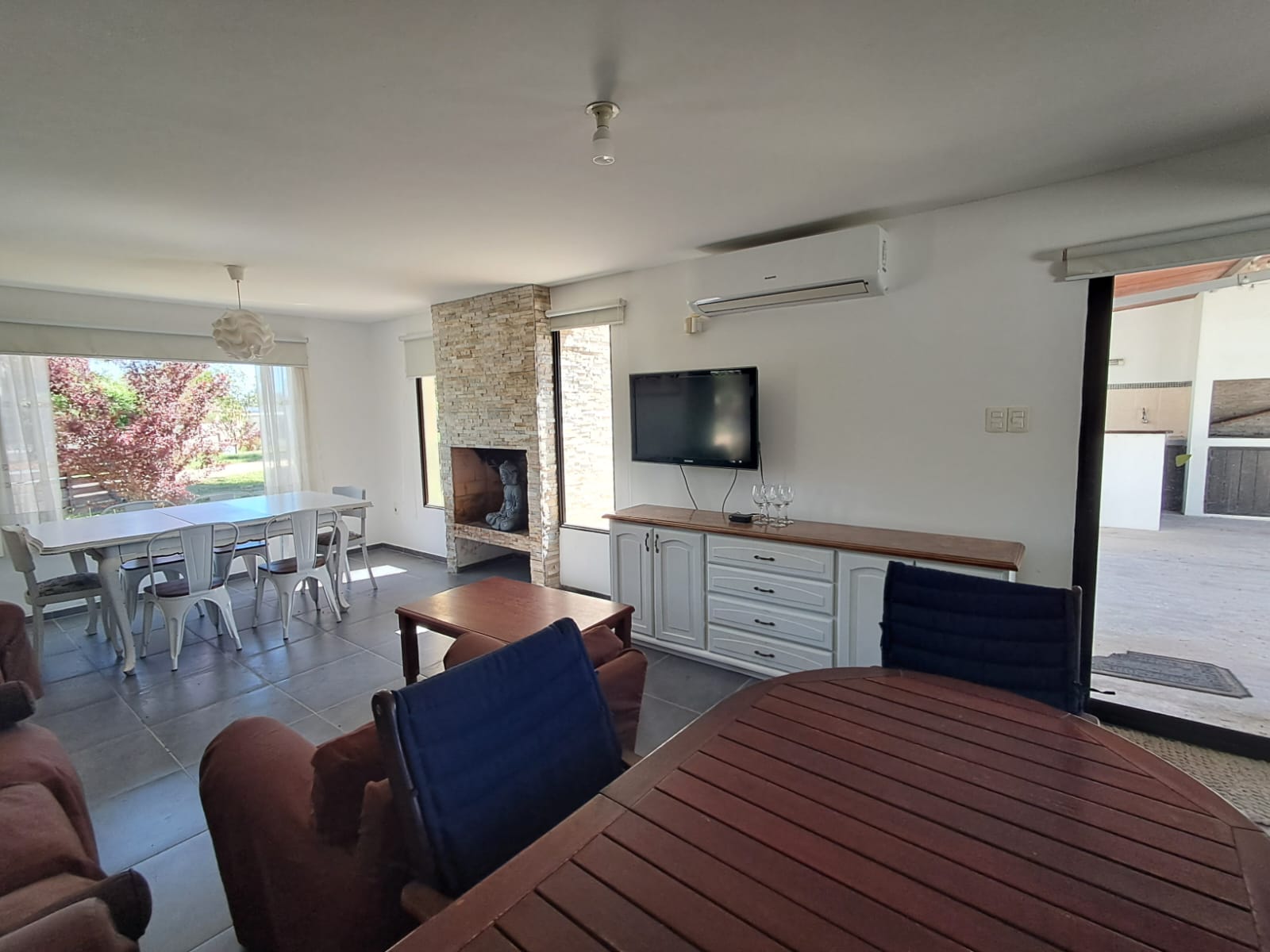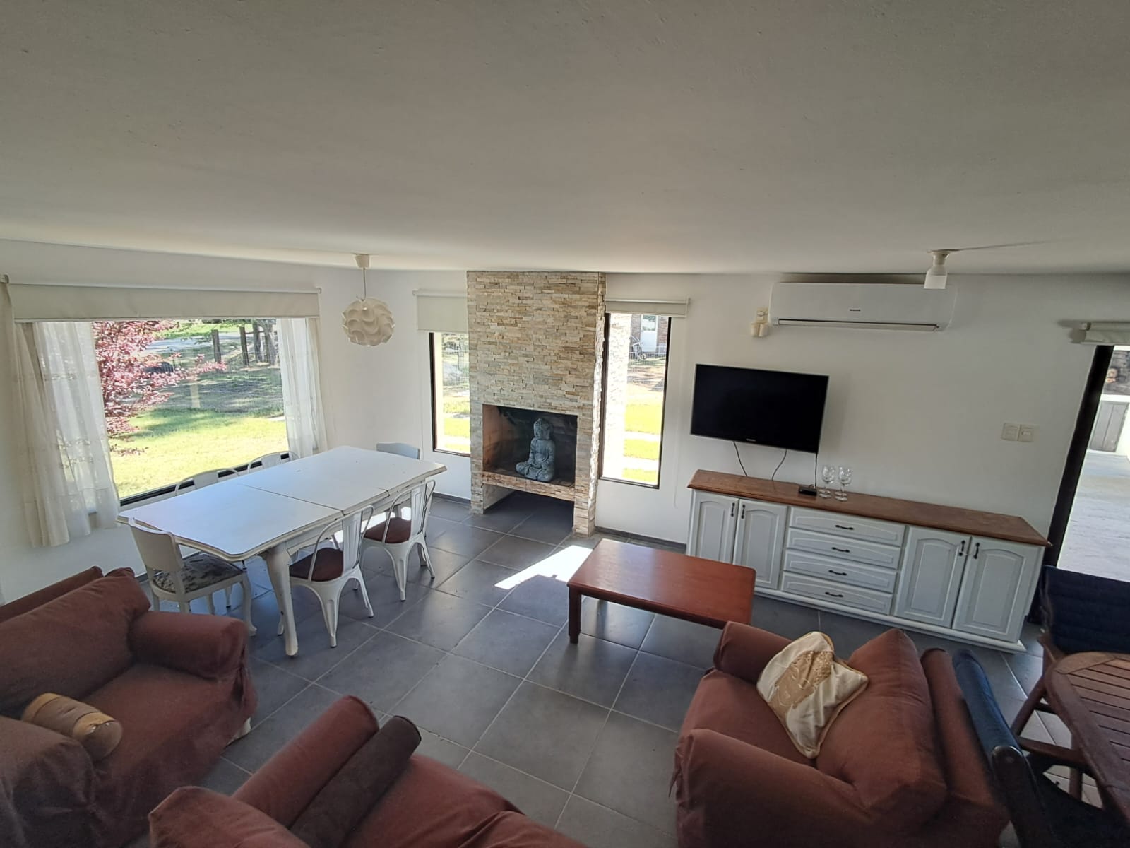 Una estufa a leña estratégicamente ubicada aporta calidez y confort al ambiente.