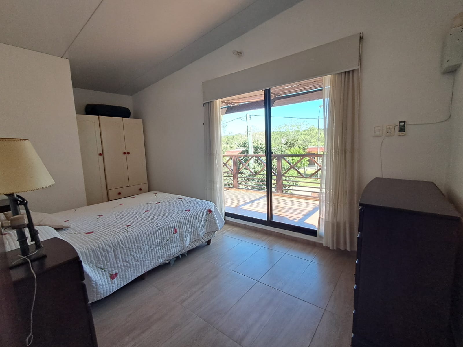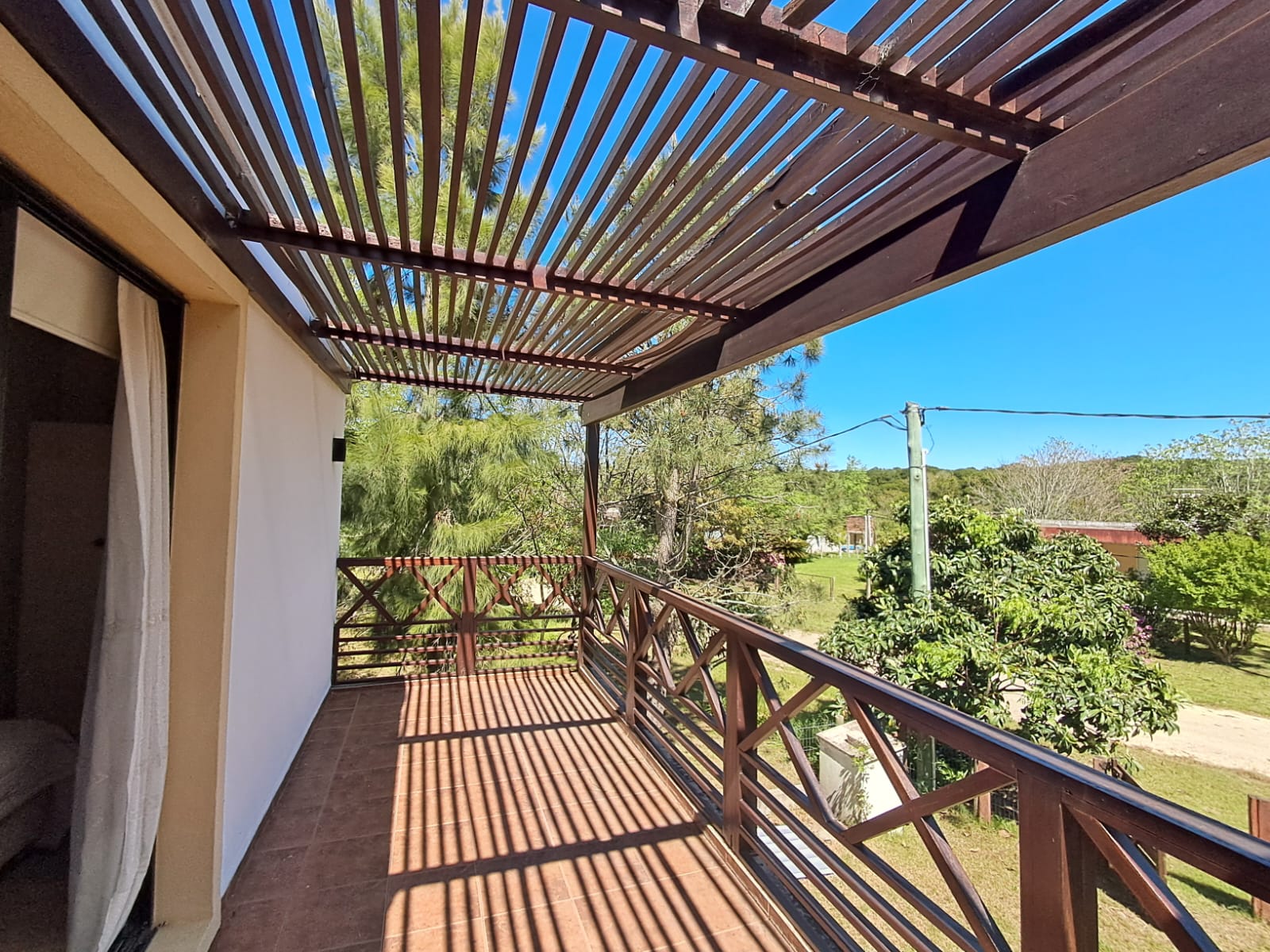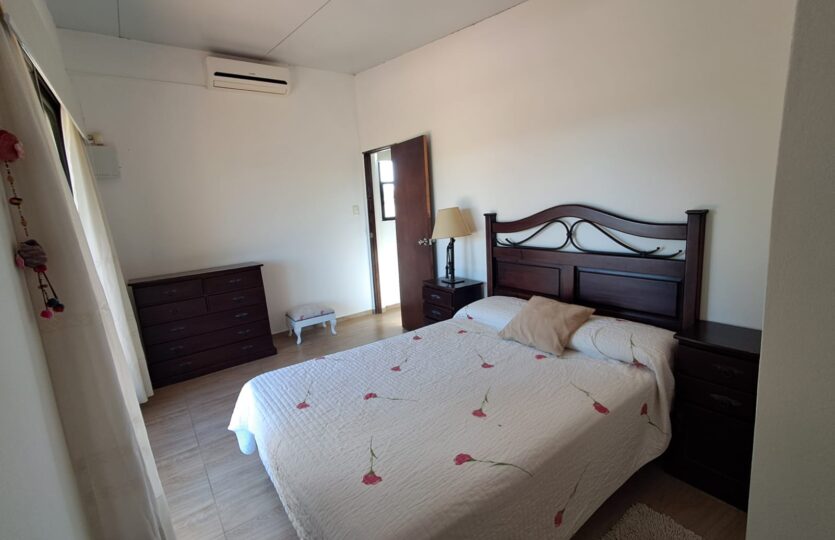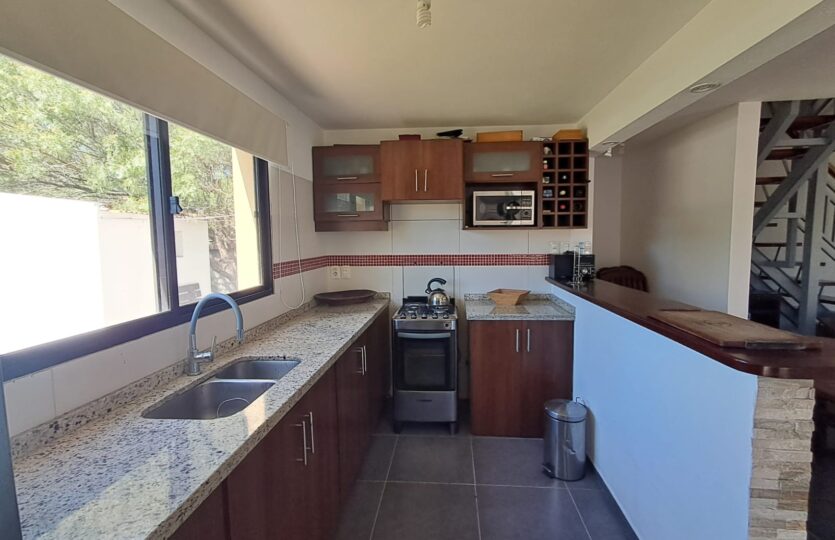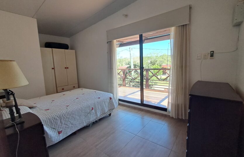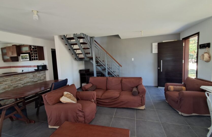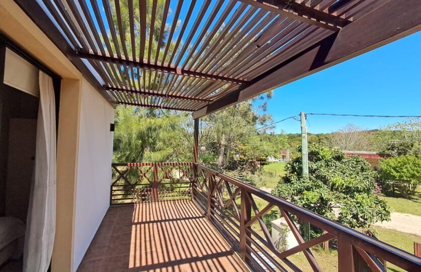 El acceso a la planta alta se realiza mediante una escalera de hierro y madera, donde se dispone el dormitorio principal con terraza y pérgola de madera, un segundo dormitorio, un baño completo y un amplio pasillo.