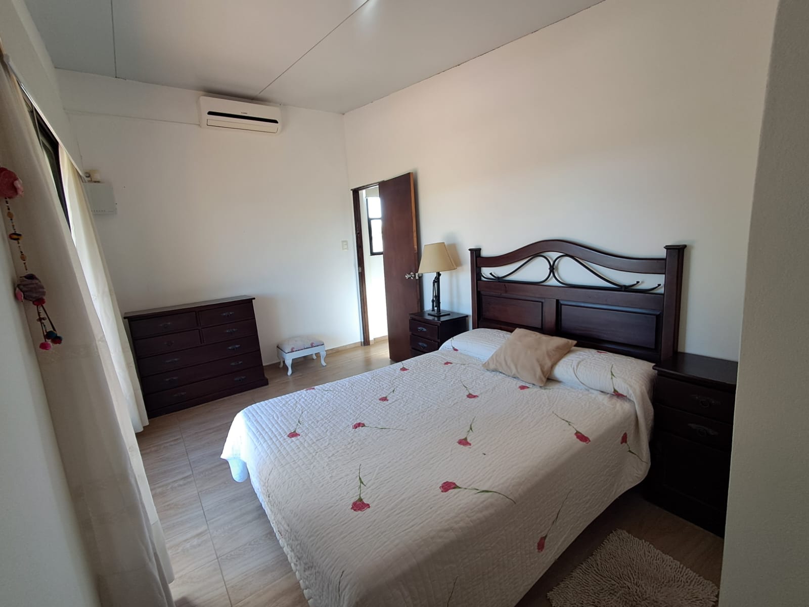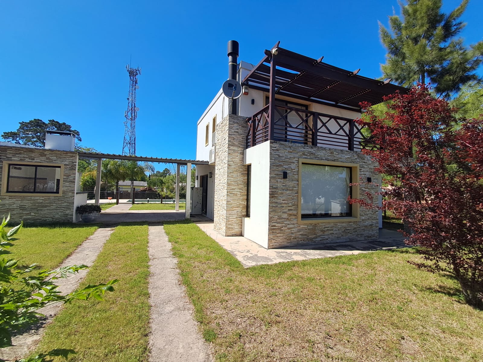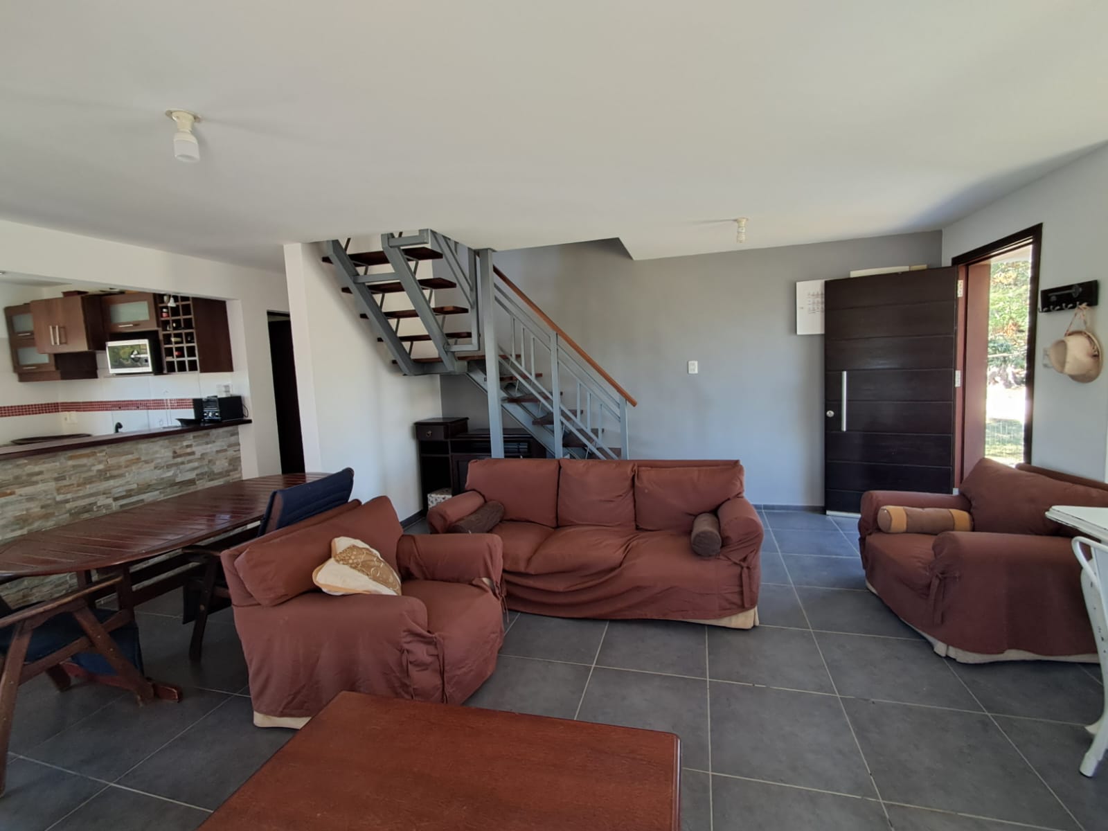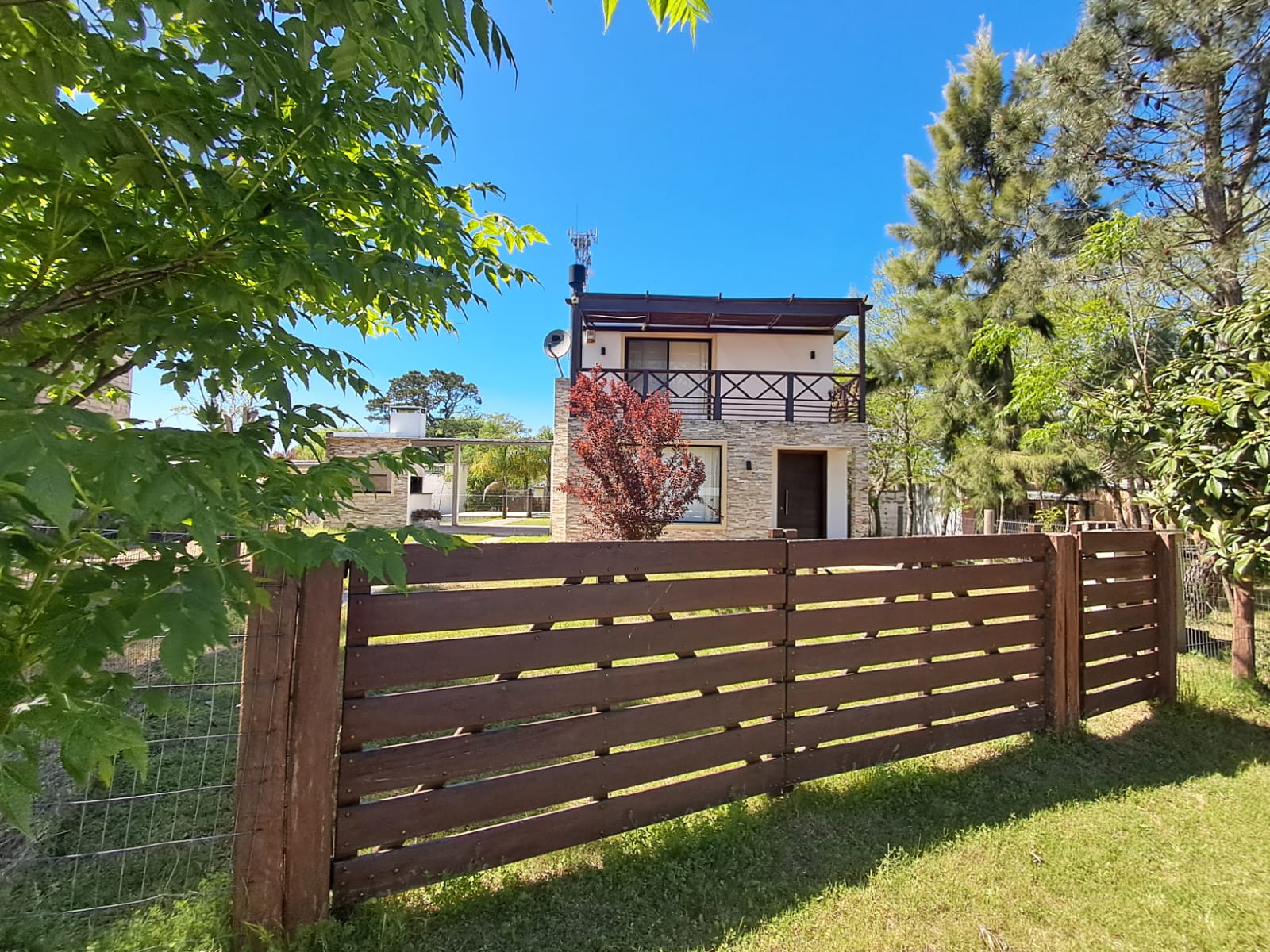 El acceso a la planta alta se realiza mediante una escalera de hierro y madera, donde se dispone el dormitorio principal con terraza y pérgola de madera, un segundo dormitorio, un baño completo y un amplio pasillo.